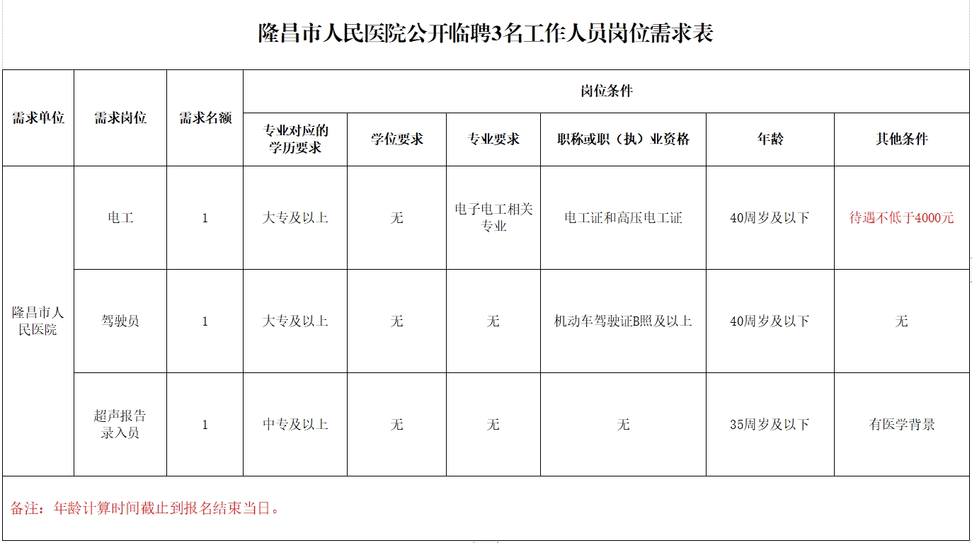 隆昌市人民医院 2024年上半年公开临聘3名工作人员公告 因工作需要,现面向社会公开临聘3名工作人员,具体事宜公告如下: 一、招聘原则 (一)面向社会,公开临聘。 (二)公开、平等、竞争、择优。 二、招聘条件 (一)基本条件: 1.身体健康,符合公务员健康体检标准。 2.吃苦耐劳、遵纪守法、服从管理、无不良记录,具备较强团队合作意识和敬业精神。 3.学历学位受国家认可。 (二)具有下列情形之一者,不得应聘: 1.曾受过各类刑事处罚的。 2.曾被开除党籍、开除公职的。 3.有违法、违纪行为正在接受审查、调查的。 4.尚未解除党纪、政务处分的。 5.被确定为失信被执行人的。 6.法律、法规规定不得招聘的其他情形的。 三、招聘岗位要求 见《隆昌市人民医院公开临聘3名工作人员岗位需求表》 四、薪酬待遇 工资待遇不低于内江地区最低工资标准(1970元),按照相关政策购买保险(养老、医疗、生育、工伤、失业)。 五、报名 (一)报名时间:2024年3月7日至2024年3月20日 (工作日,08:00-12:00、14:30-17:30)。 (二)报名方式:现场报名。 (三)报名地点:隆昌市人民医院人事科(隆昌市慢病院4楼),咨询电话:0832-3961327。 (四)报名提交资料:应聘者本人简历、二代身份证、户口簿、学历证明、持有证照的原件及复印件各1份。 隆昌市人民医院 2024年3月6日